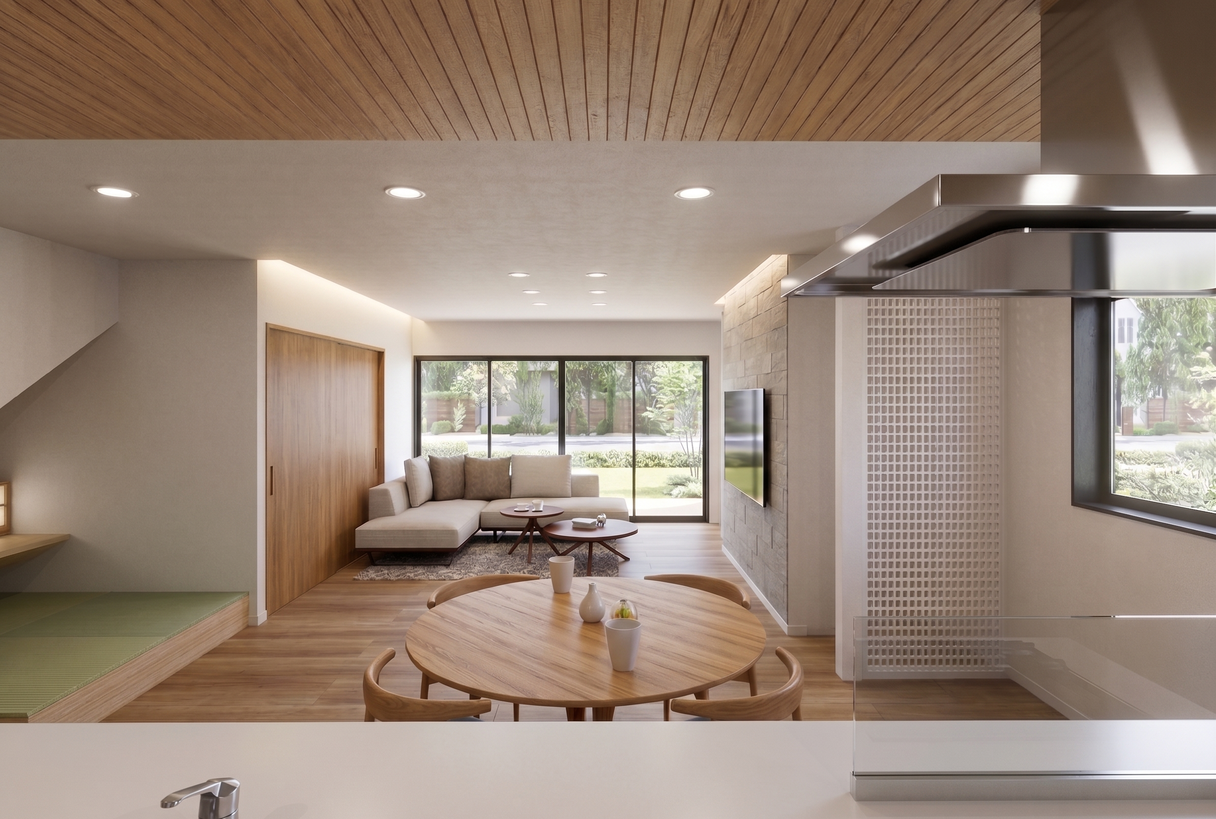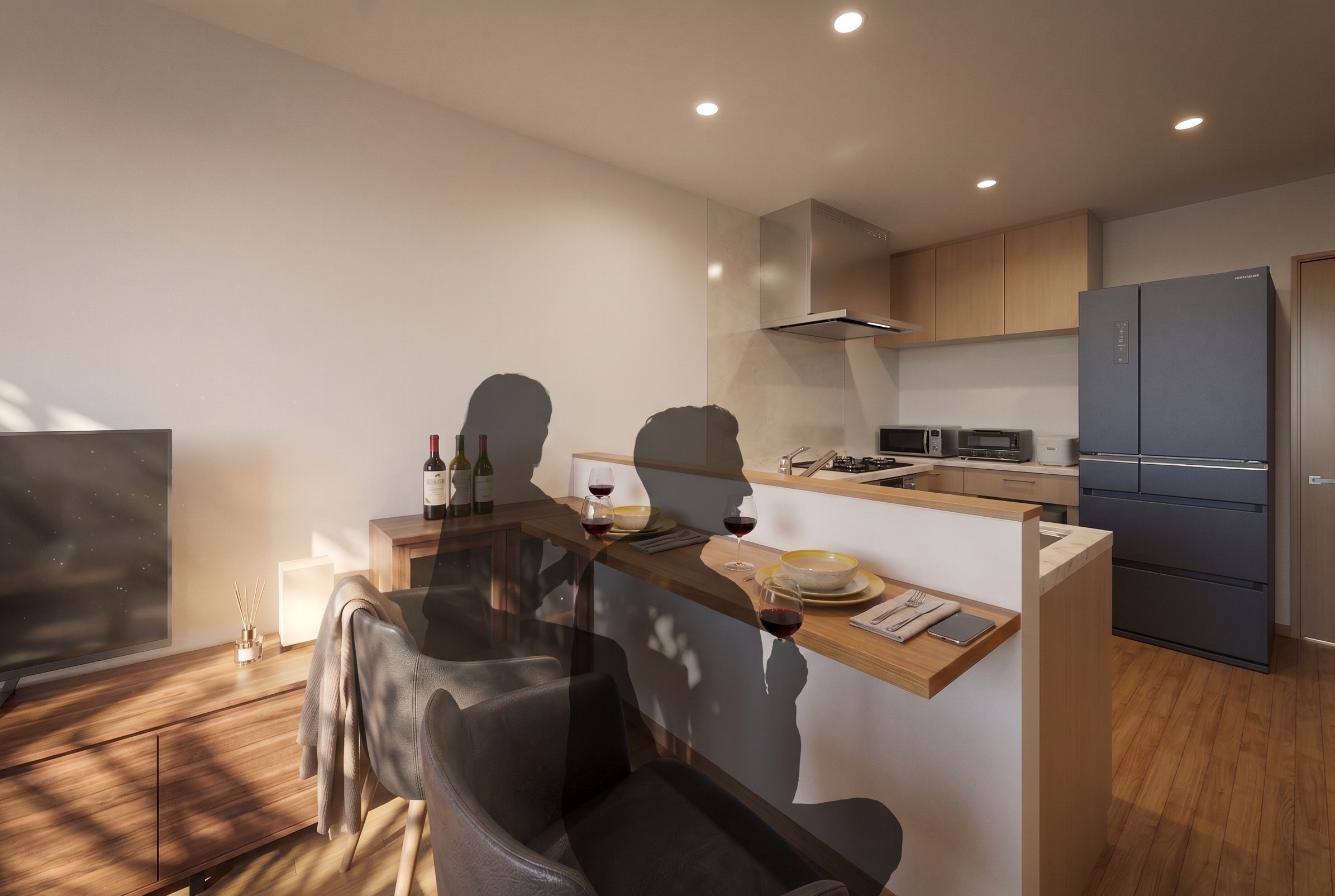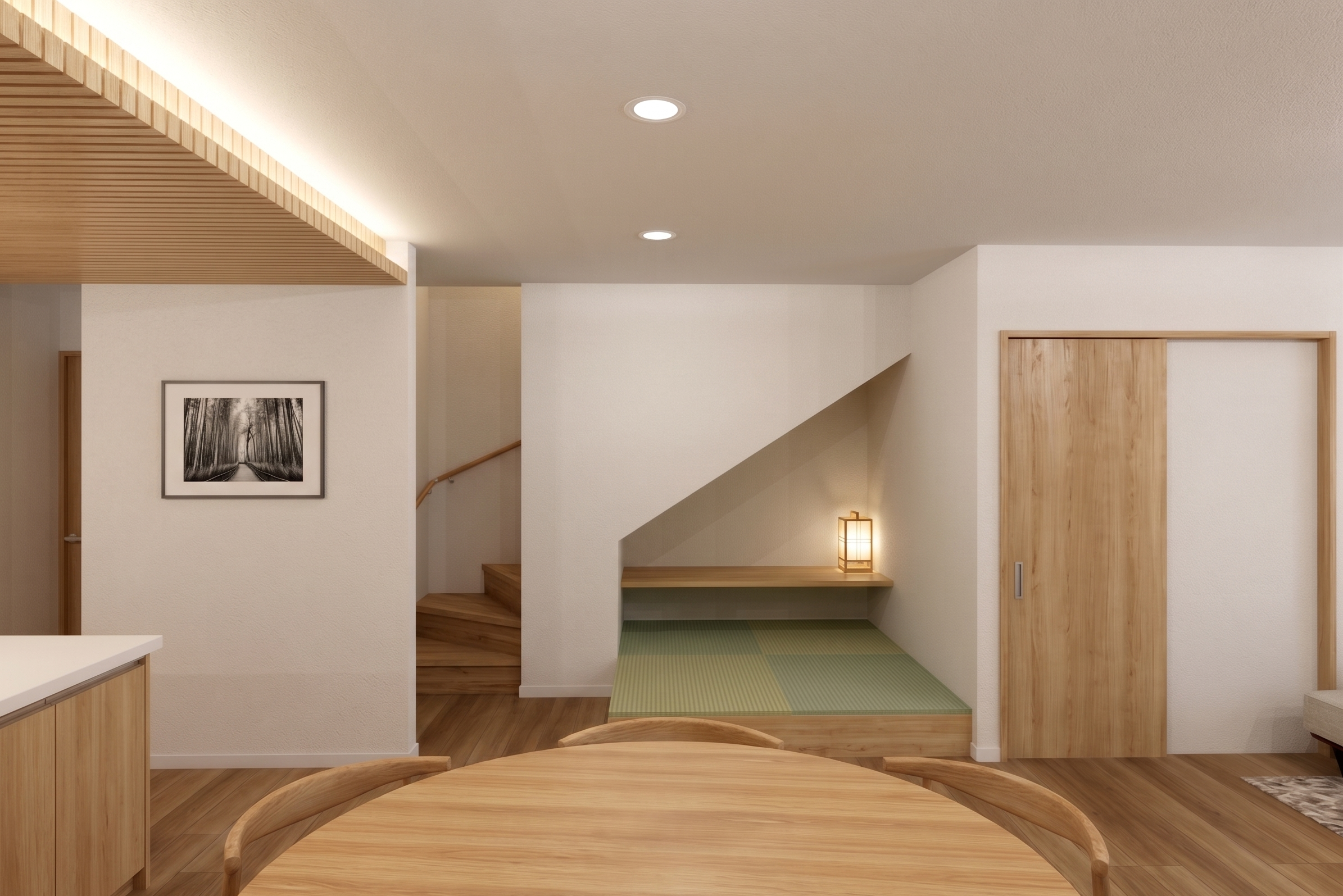 間接照明が照らし出す素材の表情。開放感あふれるLDKが、家族の絆をより深く、温かくつなぐ。